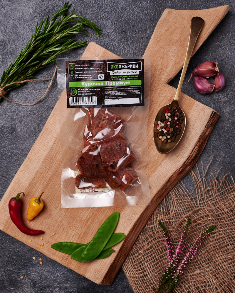 Джерки мясные «Курочка премиум» - изготовлены из сушеного мяса филе грудки курицы. Ароматный, вкусный фермерский деликатес, выбор гурманов и мясоедов! Отличный белковый легкий правильный перекус для тех кто следит за своим питанием, ведь куриные чипсы являются 100% натуральным продуктом без консервантов и усилителей вкуса, без гмо и глютена, в мясе максимум высокоусвояемого белка и 0% углеводов!