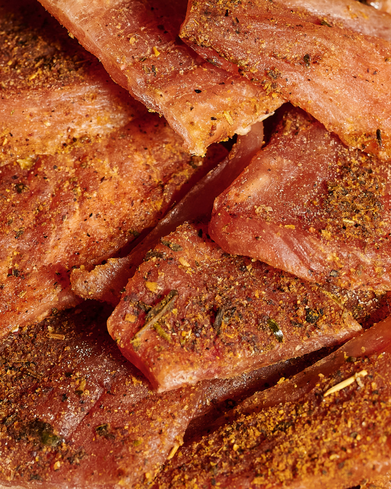 Технология сушки сохраняет в готовом продукте все полезные вещества, которые содержатся в свежем мясе: белок, жиры, витамины (в первую очередь А, В и РР), микроэлементы (магний, железо, фосфор, кальций, цинк), аминокислоты. Джерки упакованы в вакуумный пакет, что обеспечивает длительную сохранность продукта в первоначальном виде.