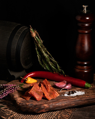 Готовые сыровяленые ломтики сделаны из качественного мяса категории А. В джерках используются оригинальные специи которые придают мясным ломтикам особенность вкуса. Кусочки сушеного мяса оценит любитель здорового образа жизни, ведь Чипсы из натурального мяса - это готовый натуральный высокоэнергетический продукт, сбалансированный перекус в течении дня. Снэки можно использовать в качестве самостоятельной закуски для вашего стола, и еще они станут отличным дополнением к фужеру крафтового темного нефильтрованного или бокалу светлого пенного пивного напитка, вину.